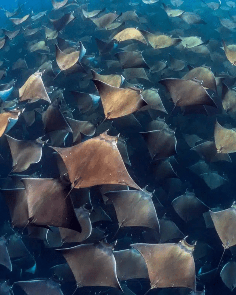 En Mag Bay, el enfoque cambia hacia lo inesperado: mobulas, delfines, actividad pelágica, aves cazando en superficie y un océano abierto donde siempre puede aparecer algo más grande.
